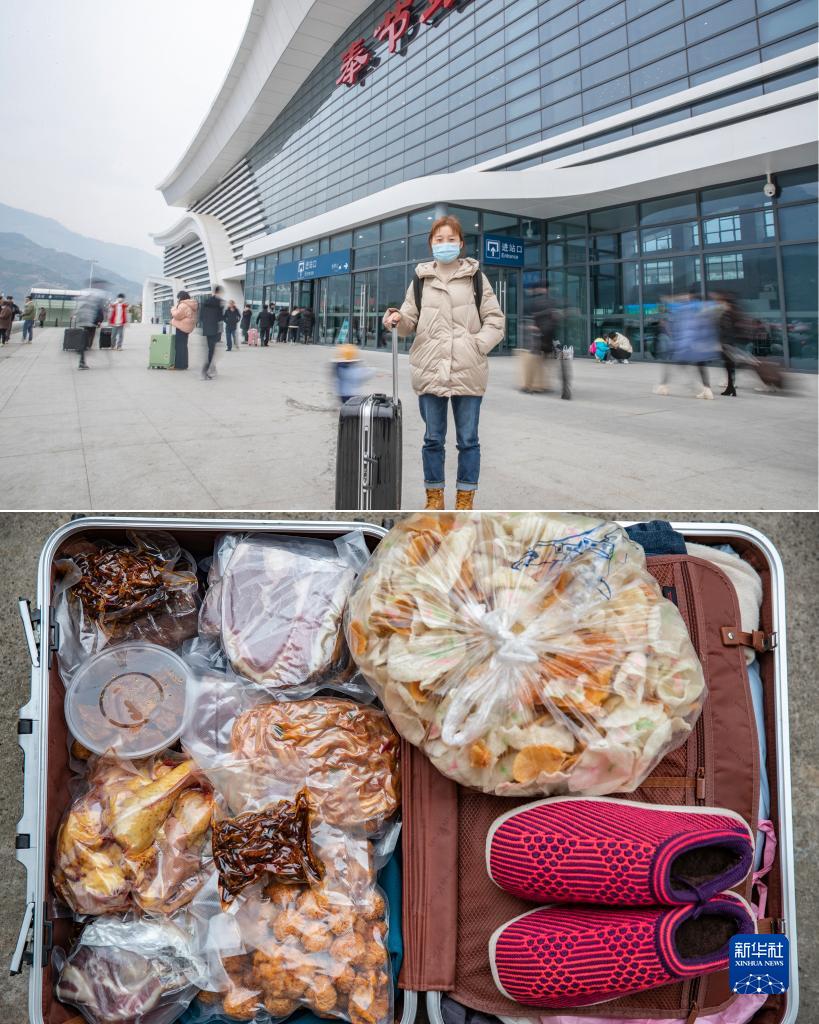 拼版照片:上圖為重慶市巫溪縣花臺鄉花臺村人劉明興在奉節站候車(chē),準備去往重慶主城上班(1月26日攝)。劉明興在重慶主城已工作了8年,因為各種原因已經(jīng)兩年沒(méi)能回老家過(guò)春節,今年專(zhuān)門(mén)回家陪家人一起過(guò)節。下圖為劉明興行囊里裝的物品(1月26日攝)。除了自己帶的衣物外,劉明興行囊里裝滿(mǎn)了家人給準備的土雞、臘肉、自制的牛肉干和母親為她親手鉤織的棉鞋等物品。