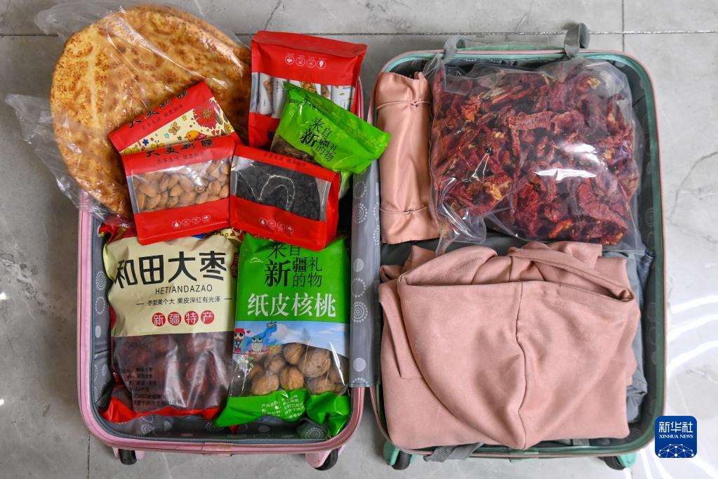 戴詩(shī)蕊行囊里裝的物品(1月25日攝)。從上大學(xué)開(kāi)始,每年離開(kāi)家時(shí),戴詩(shī)蕊的父母總會(huì )在她行李中放滿(mǎn)馕、和田大棗、紙皮核桃、辣皮子等新疆特色食品。