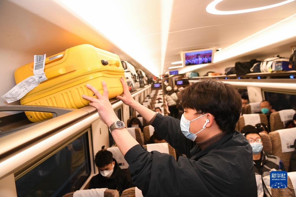 1月27日,在重慶沙坪壩站,旅客在列車(chē)車(chē)廂內放置行李。