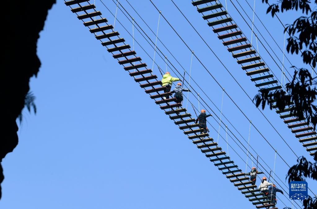 1月27日,游客在湖北省宣恩縣鑼圈巖地質(zhì)公園體驗高空行走。