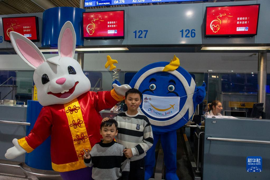 1月26日,在希臘雅典國際機場(chǎng),兩名準備搭乘航班前往中國的小乘客與裝扮成兔子造型的工作人員合影。