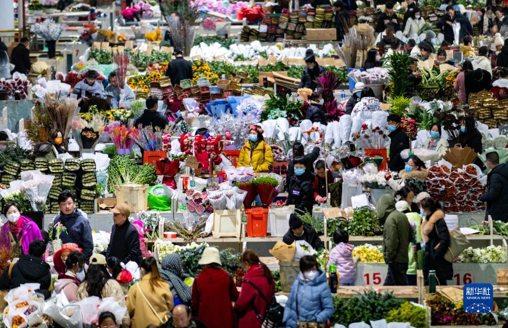 當日是大年初六,位于云南省昆明市的斗南花市內人頭攢動(dòng),人們逛花市、買(mǎi)鮮花,歡度假期。