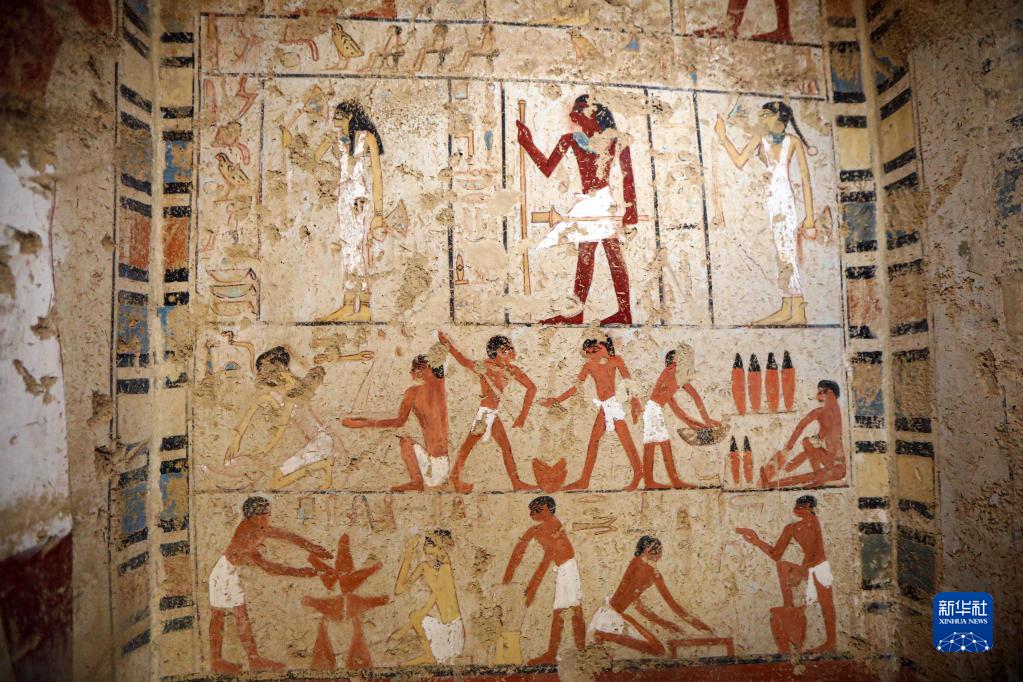 這是1月26日在埃及塞加拉地區考古發(fā)掘現場(chǎng)拍攝的一座墓葬墻上的裝飾。