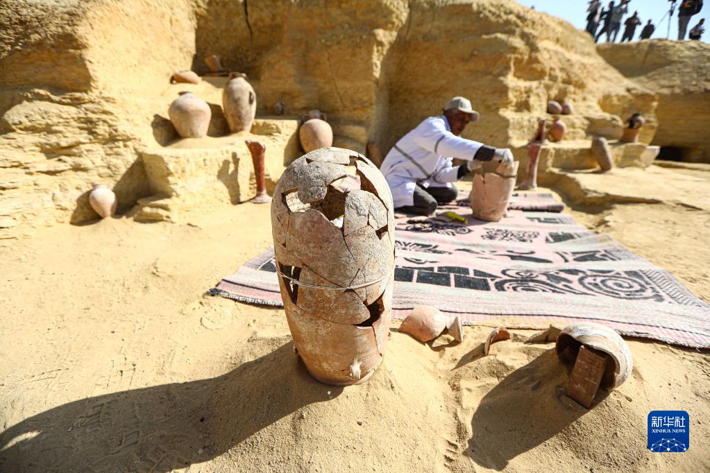 這是1月26日在埃及塞加拉地區考古發(fā)掘現場(chǎng)拍攝的一件被修復的陶器。