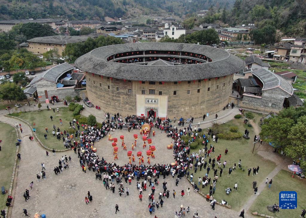 1月25日,游客在福建省龍巖市永定區土樓景區觀(guān)看民俗表演(無(wú)人機照片) 。