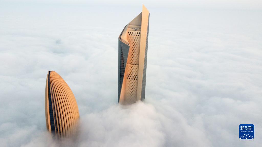 1月21日,在科威特首都科威特城,高層建筑露出籠罩在城市上空的云霧間(無(wú)人機照片)。