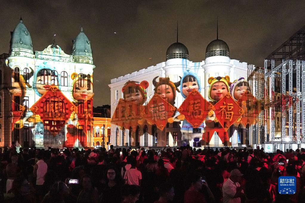 1月19日,人們在巴西累西腓市舉行的中國春節慶?;顒?dòng)上欣賞燈光秀。