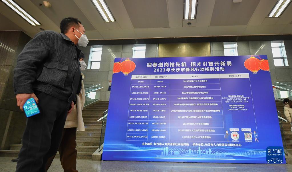 1月28日,在長(cháng)沙市人力資源市場(chǎng),求職者在查看招聘活動(dòng)日程。