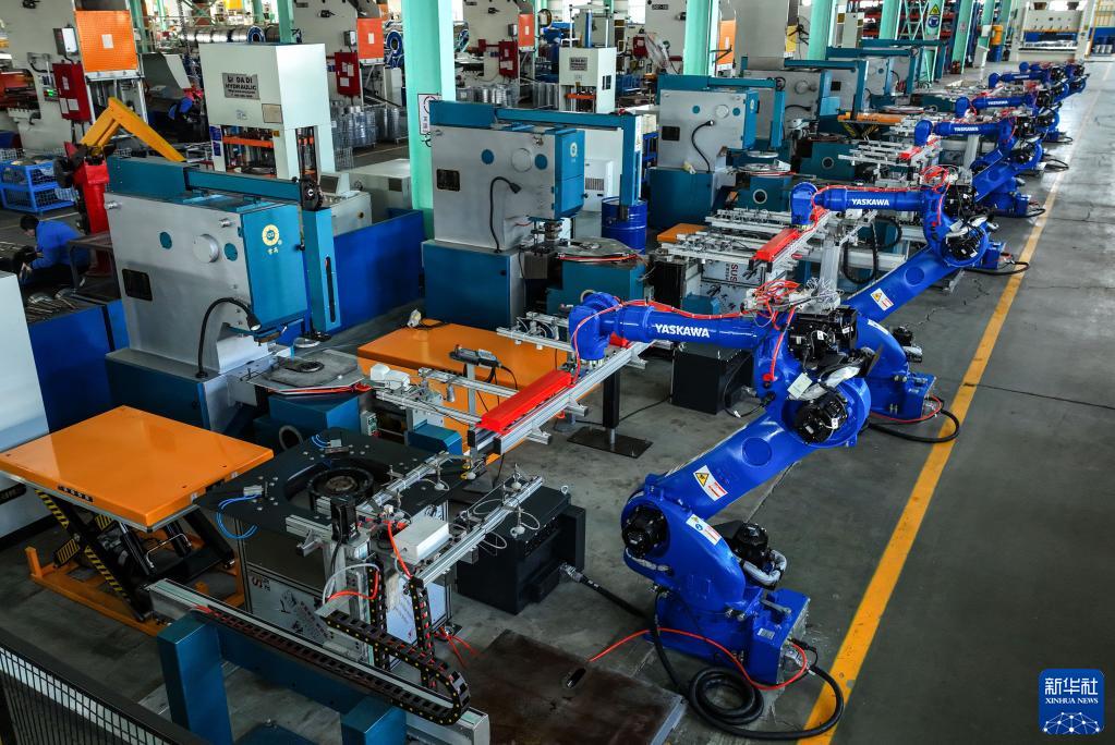 1月28日,智能機器人在山東省榮成市經(jīng)濟開(kāi)發(fā)區一家電機制造企業(yè)的智能化生產(chǎn)車(chē)間內作業(yè)(無(wú)人機照片)。