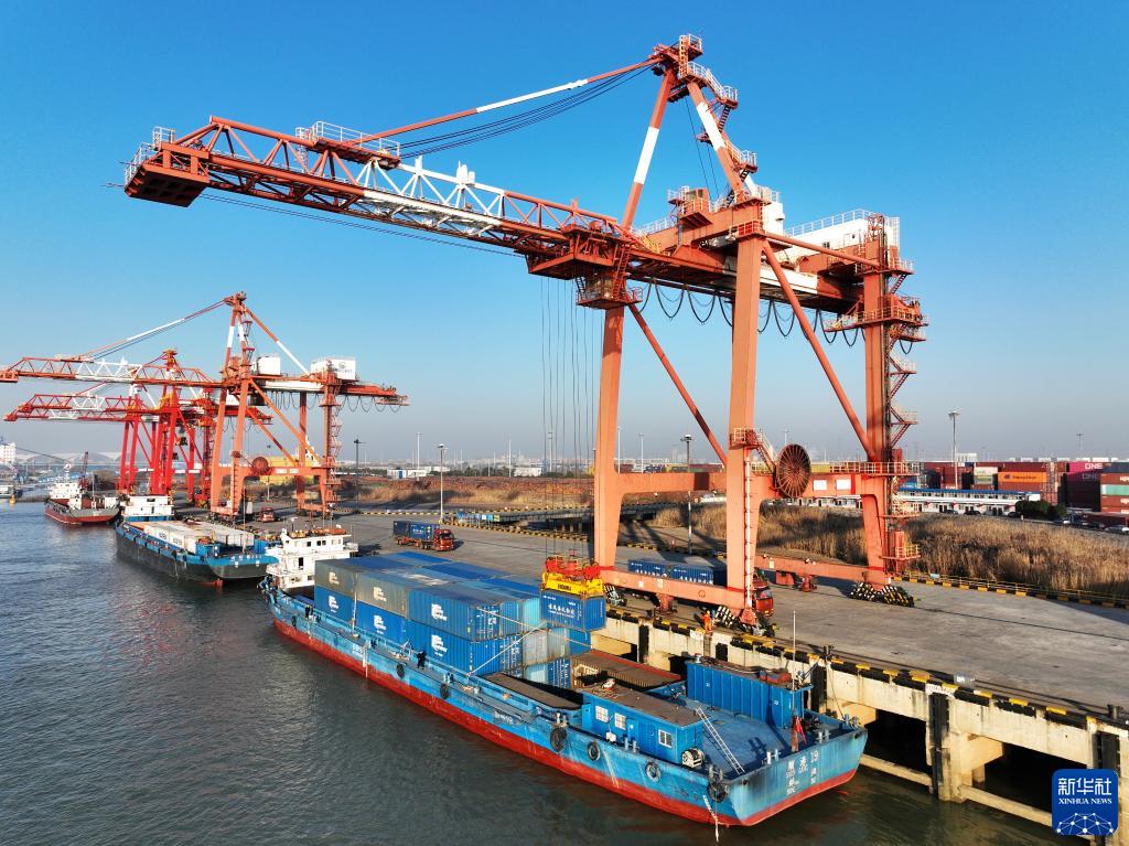 1月28日,貨輪在江蘇省揚州港集裝箱碼頭進(jìn)行集裝箱裝卸作業(yè)(無(wú)人機照片)。