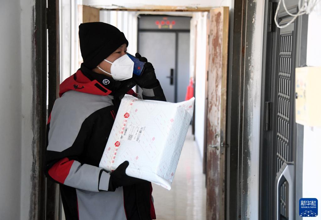 1月28日,順豐速運快遞員楊敬山在北京市海淀區中關(guān)村街道希格瑪社區的一座住宅樓內送兔年開(kāi)工第一單快件。