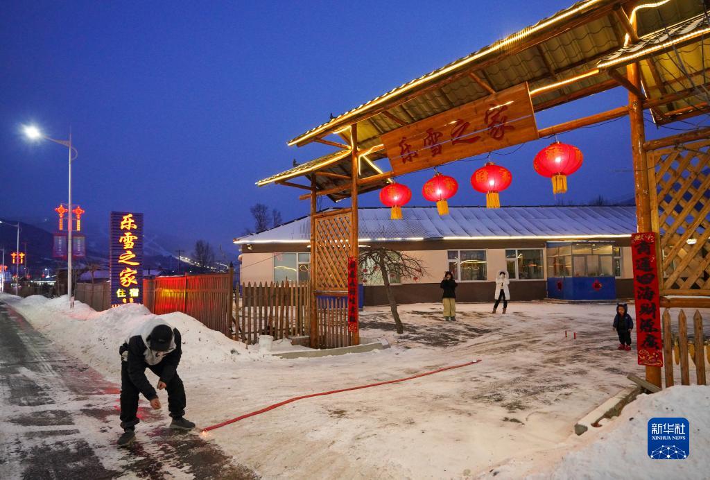 吉林市永吉縣北大湖鎮南溝村村民邵鋒在自家經(jīng)營(yíng)的樂(lè )雪之家民宿門(mén)口與雪友一起放鞭炮(1月21日攝)。新華社記者 顏麟蘊 攝