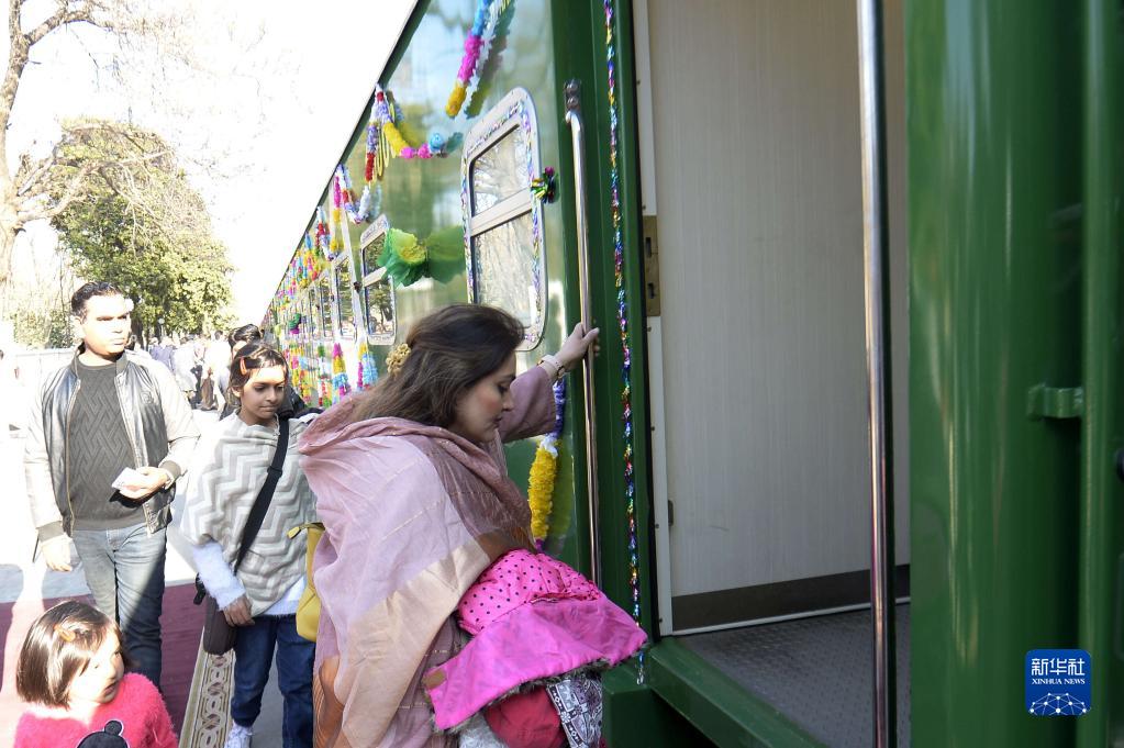1月27日,乘客在巴基斯坦伊斯蘭堡登上綠線(xiàn)特快列車(chē)組的中國進(jìn)口鐵路客車(chē)。