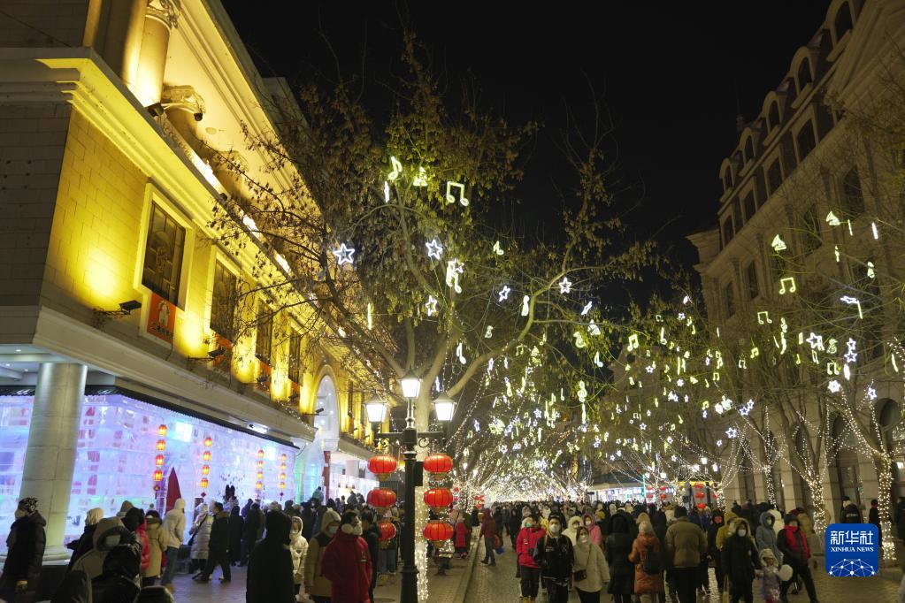 1月28日,游客從哈爾濱中央大街的“冰屋”旁經(jīng)過(guò)。