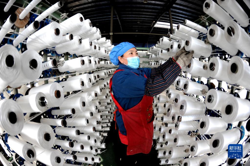 1月28日,在江蘇省連云港市一家編織袋廠(chǎng),工人在生產(chǎn)車(chē)間趕制訂單產(chǎn)品。