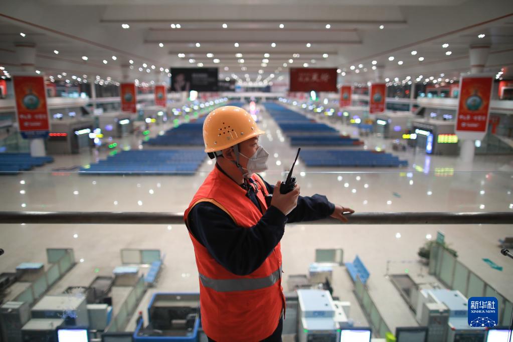 1月29日,一名工作人員在空無(wú)一人的貴陽(yáng)北站候車(chē)大廳內通過(guò)對講機和同事溝通。