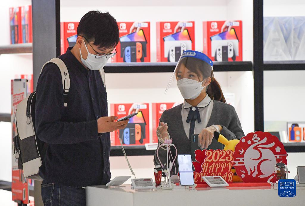 消費者在中免集團??谌赵聫V場(chǎng)免稅店選購電子產(chǎn)品(1月19日攝)。