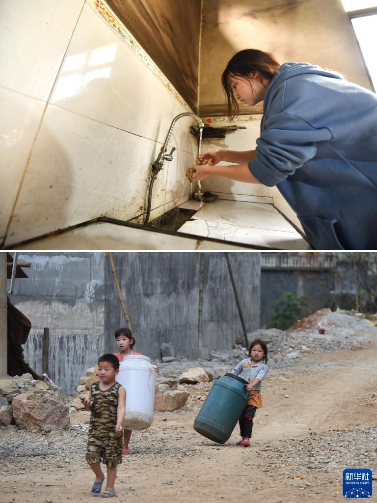 拼版照片:上圖為2023年1月21日,在弄勇村弄朝屯,村民藍秀雪在家里用自來(lái)水洗菜;下圖為2015年2月27日,藍秀雪(后左)搬運水桶,準備和爸爸到街上運水。