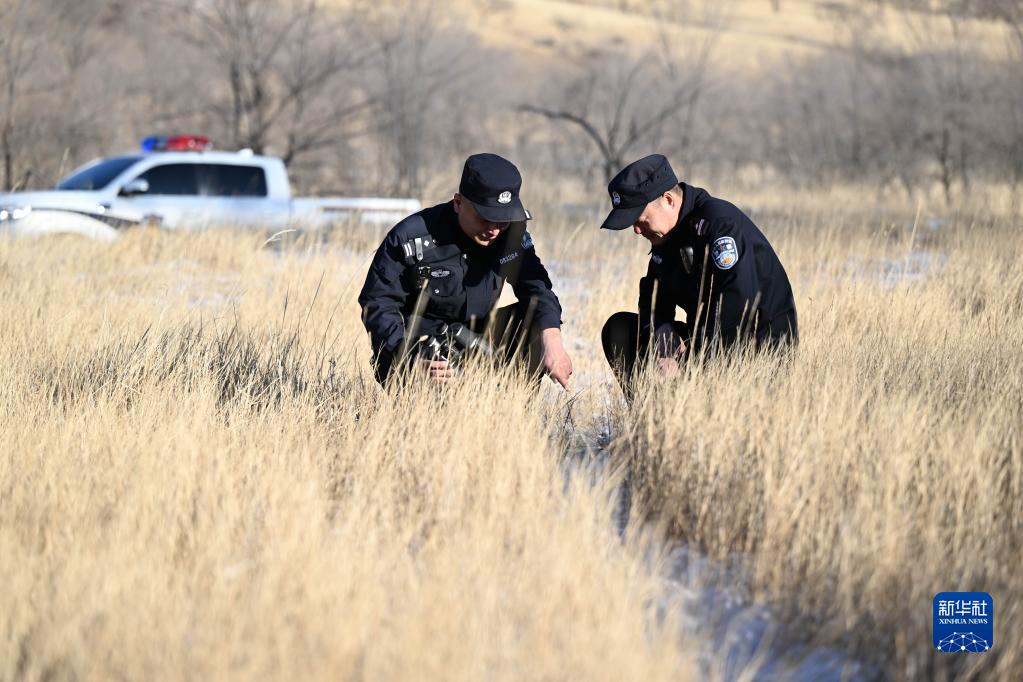 1月29日,多倫縣森林公安局灤河源國家森林公園森林公安派出所的民警在森林公園察看野生動(dòng)物蹤跡。