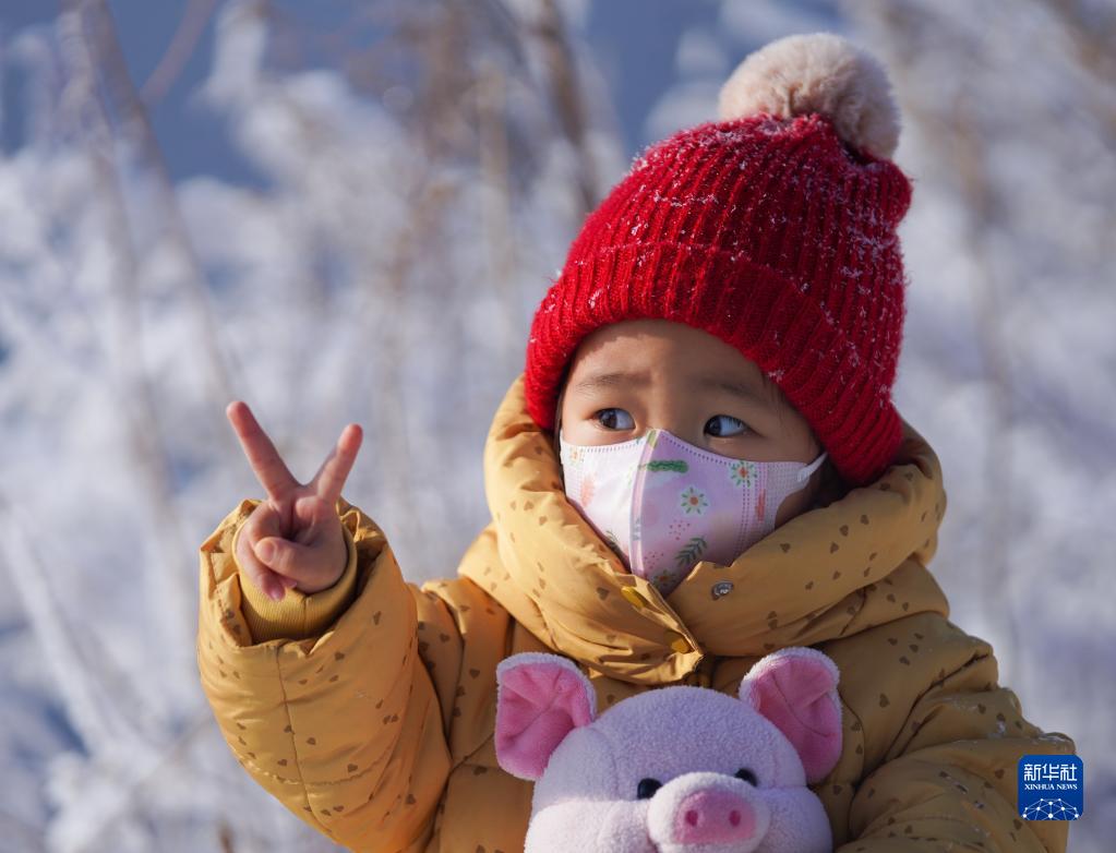1月30日,小朋友在霧凇前拍照。