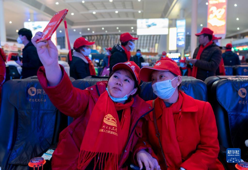 1月30日,兩名務(wù)工人員在昆明南站候車(chē)廳候車(chē)時(shí)拍照。