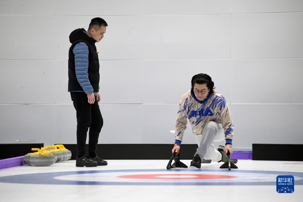 1月29日,游客(右)在“冰立方”冰上運動(dòng)中心練習冰壺基礎動(dòng)作。