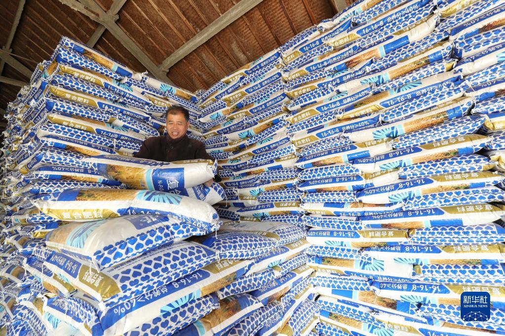 1月29日,在浙江省湖州市德清縣阜溪街道供銷(xiāo)農資儲備中心,工人在碼放春耕備耕農資。