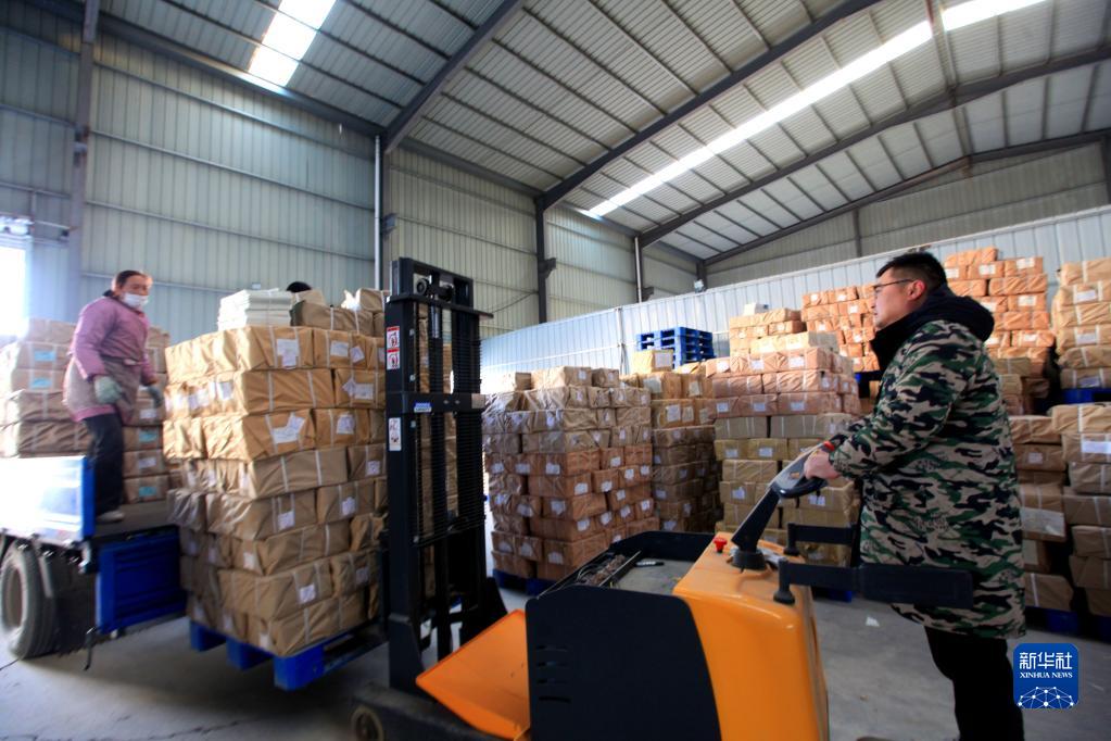 1月30日,在山東省臨沂市平邑縣新華書(shū)店倉庫,工作人員在搬運教材。