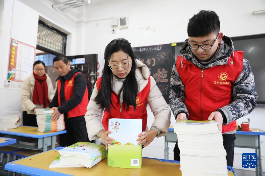 1月30日,在河南省寶豐縣山河路小學(xué),教師在清點(diǎn)教材。
