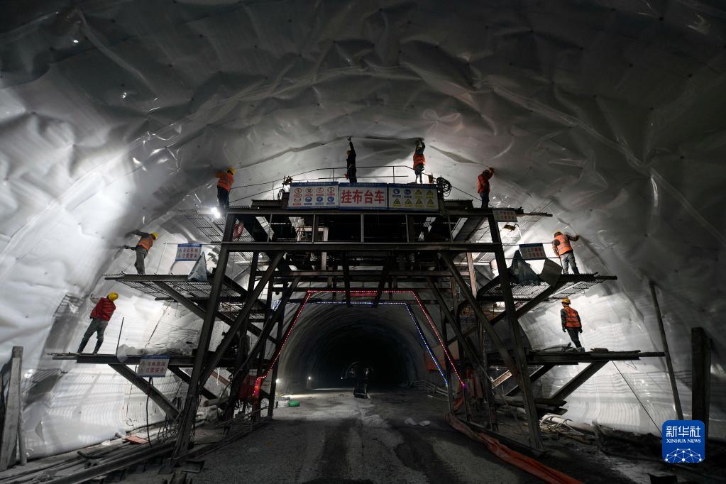 1月30日,在首都地區環(huán)線(xiàn)高速公路承德至平谷段楊家窩鋪特長(cháng)隧道施工現場(chǎng),工人在鋪設防水板。