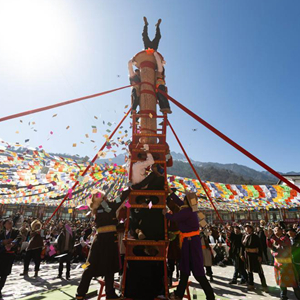1月30日,當地藏族群眾表演傳統民俗雜技“天鵝抱蛋”。