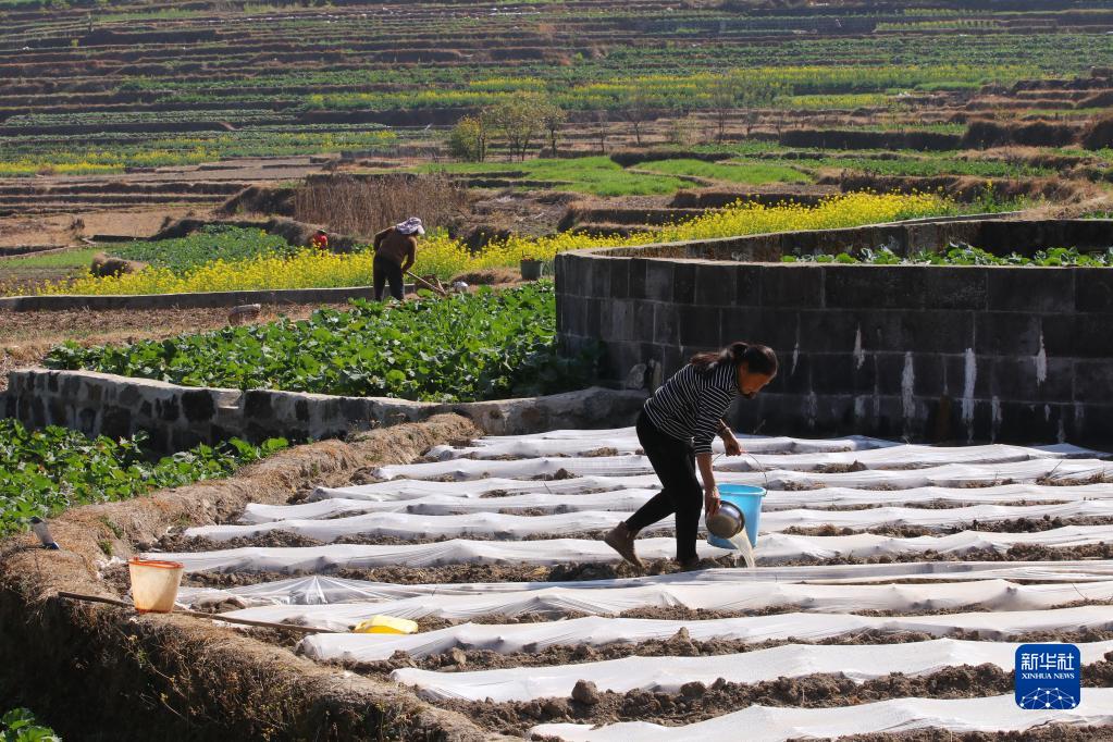 1月30日,在云南省騰沖市清水鎮大寨村,村民給剛種下的玉米澆水。