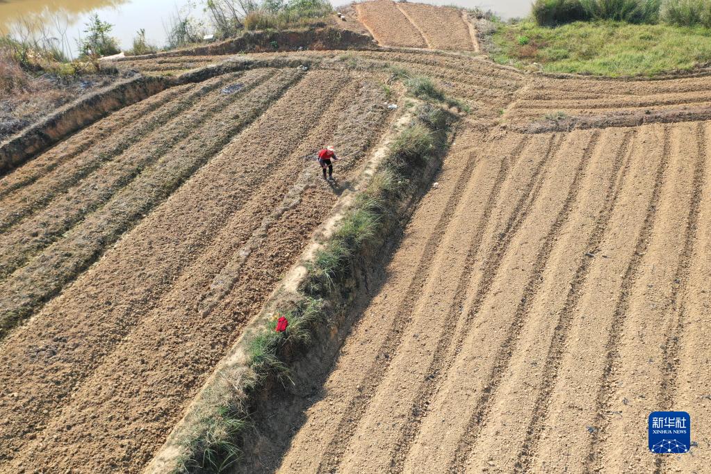 1月30日,村民在廣西南寧市青秀區仙葫經(jīng)濟開(kāi)發(fā)區那舅社區那平村平整田地(無(wú)人機照片)。