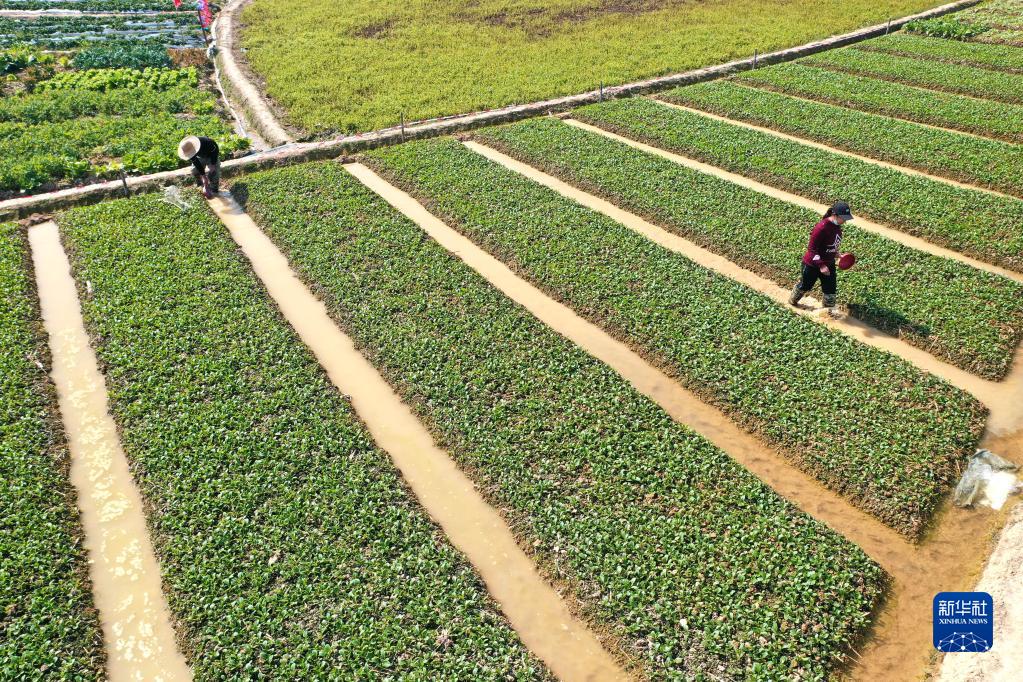 1月30日,村民在廣西南寧市青秀區仙葫經(jīng)濟開(kāi)發(fā)區那舅社區那平村給菜苗澆水(無(wú)人機照片)。