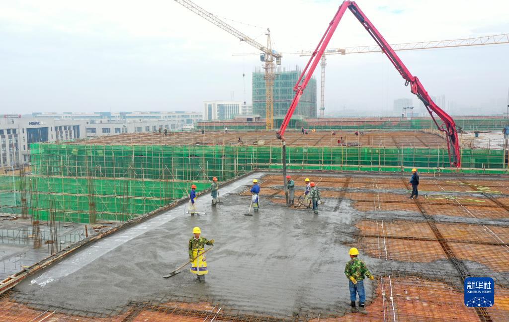 1月30日,工人在江西省吉安市永豐縣生物醫藥產(chǎn)業(yè)園標準廠(chǎng)房建設工地施工(無(wú)人機照片)。