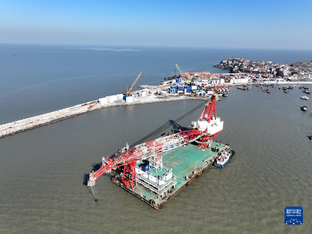 1月29日,在江蘇省連云港市連島國家級中心漁港,大型浮吊在海上作業(yè)(無(wú)人機照片)。