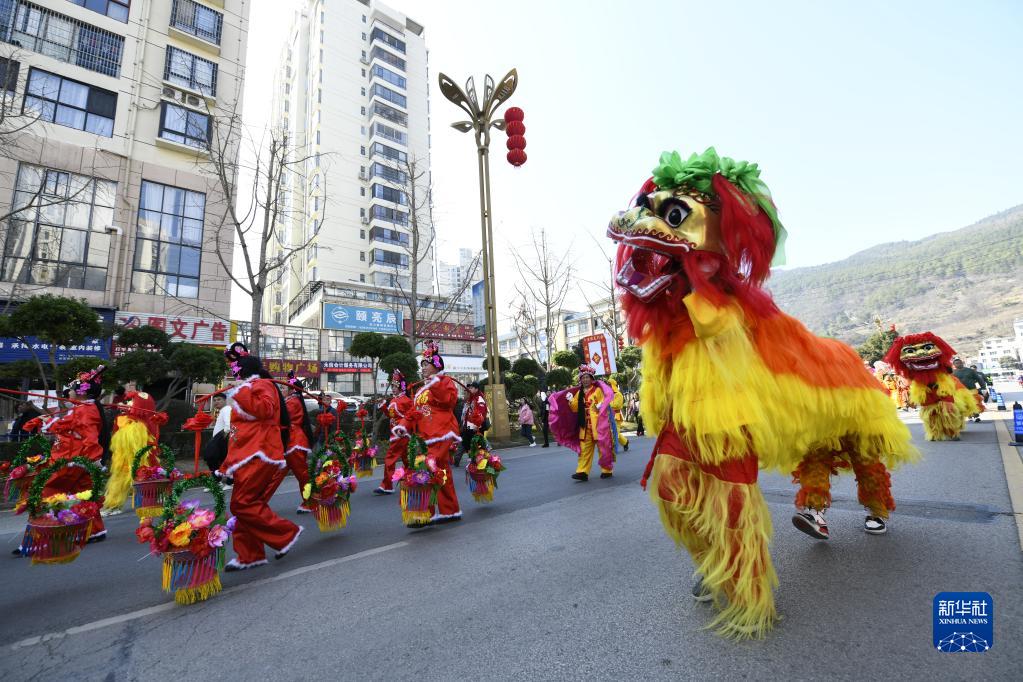 1月30日,在貴州省黃平縣新州鎮,舞獅隊在街頭巡游。