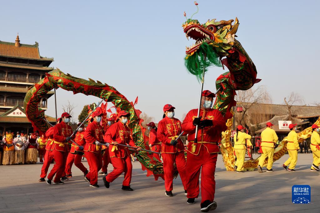 1月30日,在山東省棗莊市臺兒莊古城,民間藝人在表演舞龍。