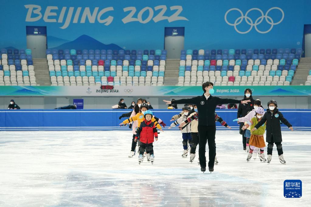 2023年1月6日,花樣滑冰世界冠軍佟?。ㄇ爸校┰诠谲姽嬲n上帶領(lǐng)小朋友學(xué)習滑冰。