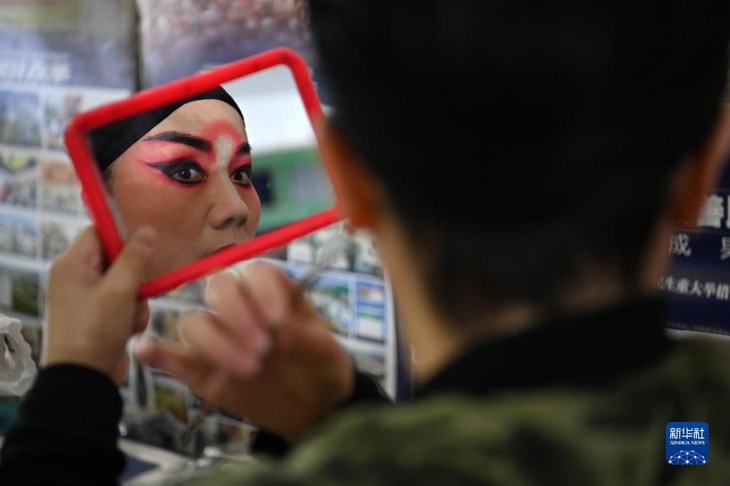 1月30日,在山西省太原市清徐縣孟封村,太原市晉劇藝術(shù)研究院實(shí)驗二團演員在后臺化裝。
