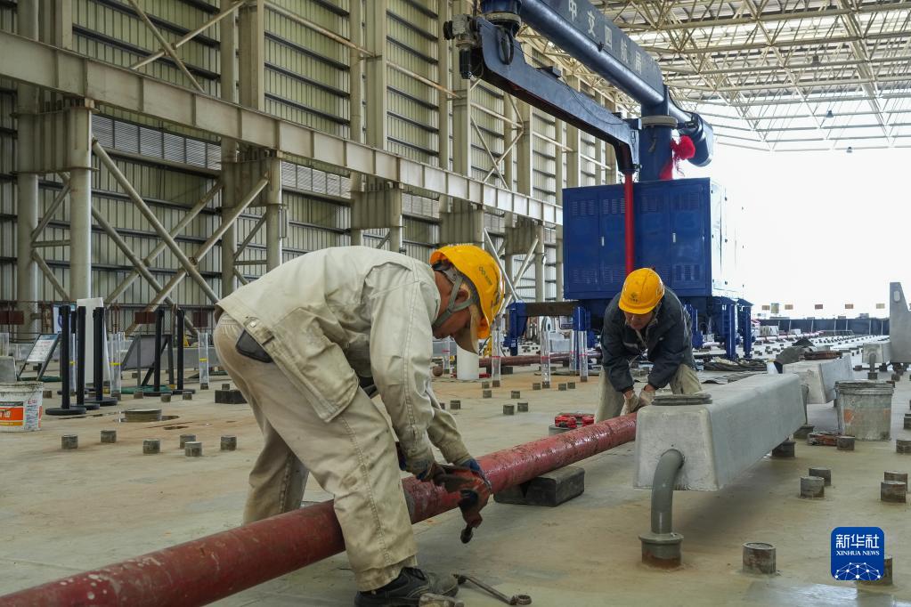 在中交四航局珠海牛頭島沉管智慧工廠(chǎng),施工人員為深中通道海底隧道最后一個(gè)管節(非標準管節、含最終接頭)澆筑布置管線(xiàn)(1月31日攝)。