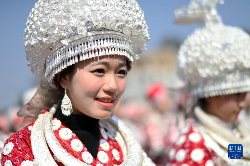 當日,在貴州省黃平縣谷隴鎮,26個(gè)村(居)的千余名苗族同胞身著(zhù)銀飾盛裝,跳板凳舞、吹蘆笙、唱苗歌,載歌載舞喜迎元宵佳節。
