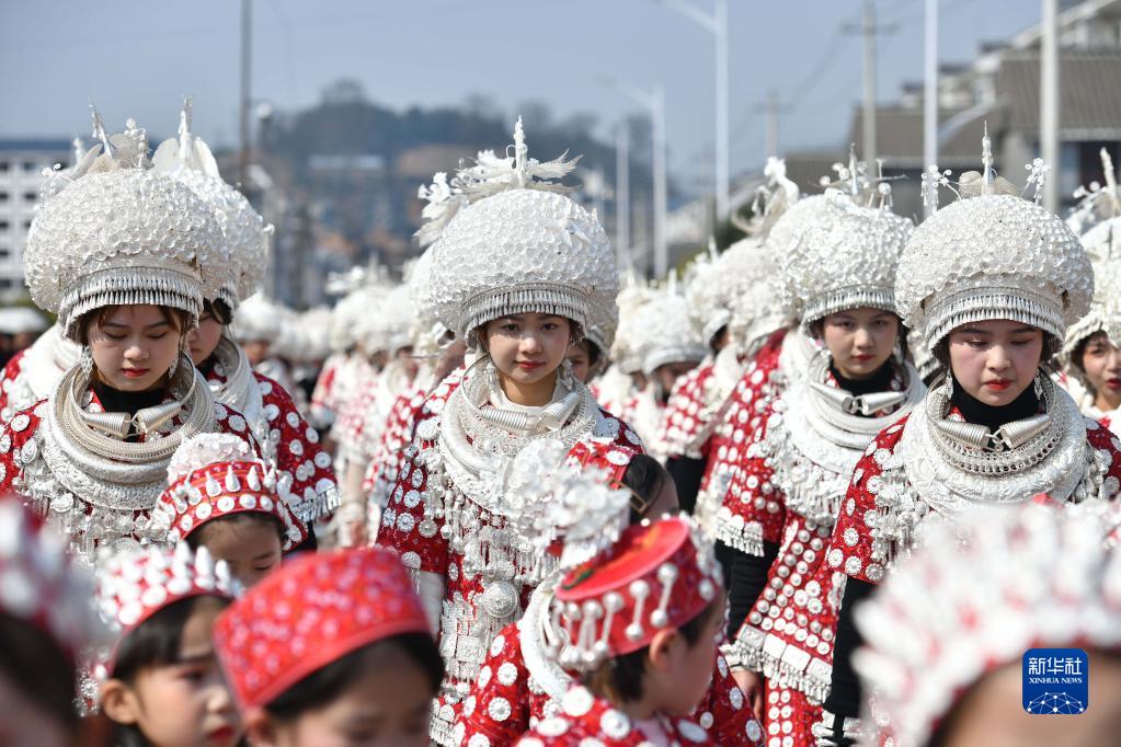 當日,在貴州省黃平縣谷隴鎮,26個(gè)村(居)的千余名苗族同胞身著(zhù)銀飾盛裝,跳板凳舞、吹蘆笙、唱苗歌,載歌載舞喜迎元宵佳節。