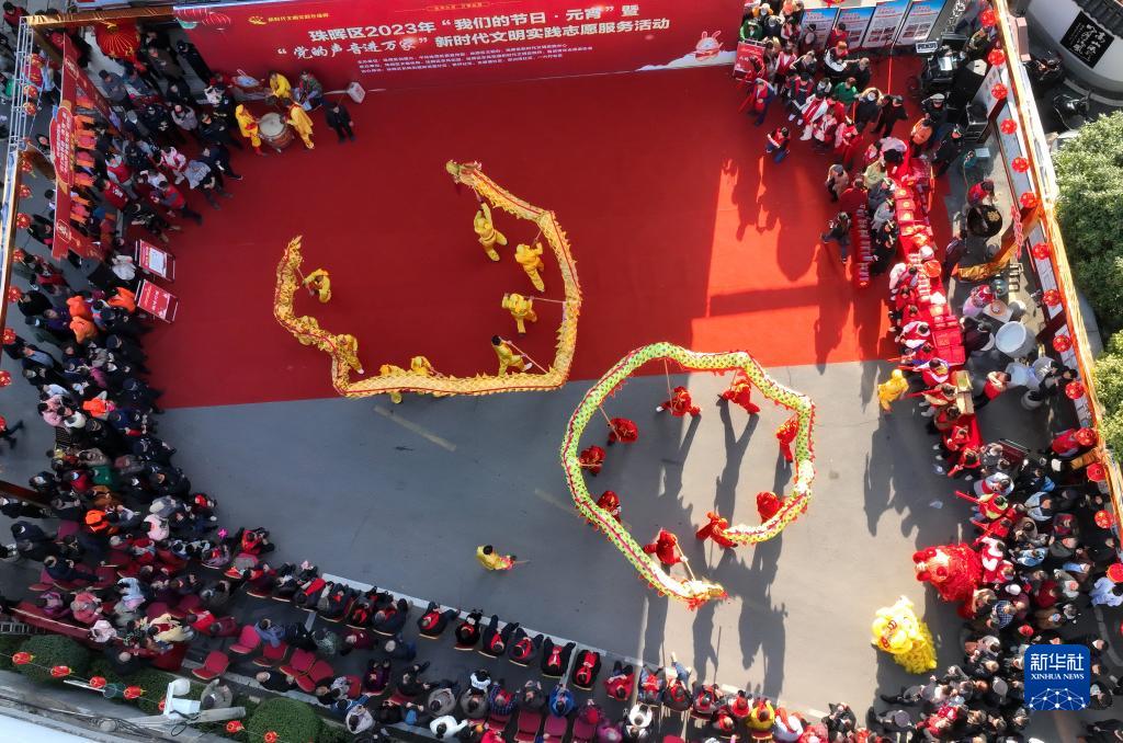 1月31日,在湖南省衡陽(yáng)市珠暉區東風(fēng)街道前進(jìn)里社區,人們舞龍舞獅迎接元宵節的到來(lái)(無(wú)人機照片)。