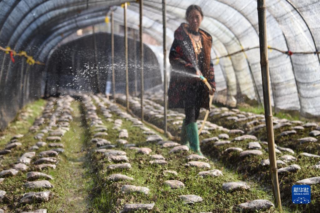 1月31日,在湖南省邵陽(yáng)市城步苗族自治縣西巖鎮資江村羊肚菌種植基地,農民給大棚里的幼菇補水。