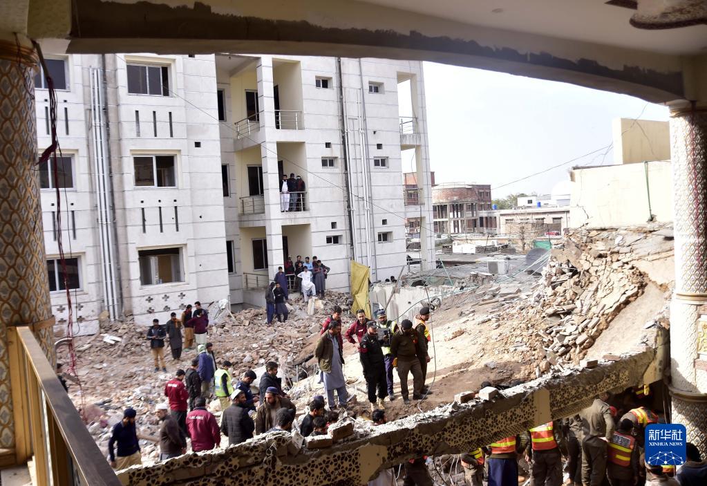 1月31日,在巴基斯坦白沙瓦,救援人員和安全人員查看爆炸襲擊現場(chǎng)。