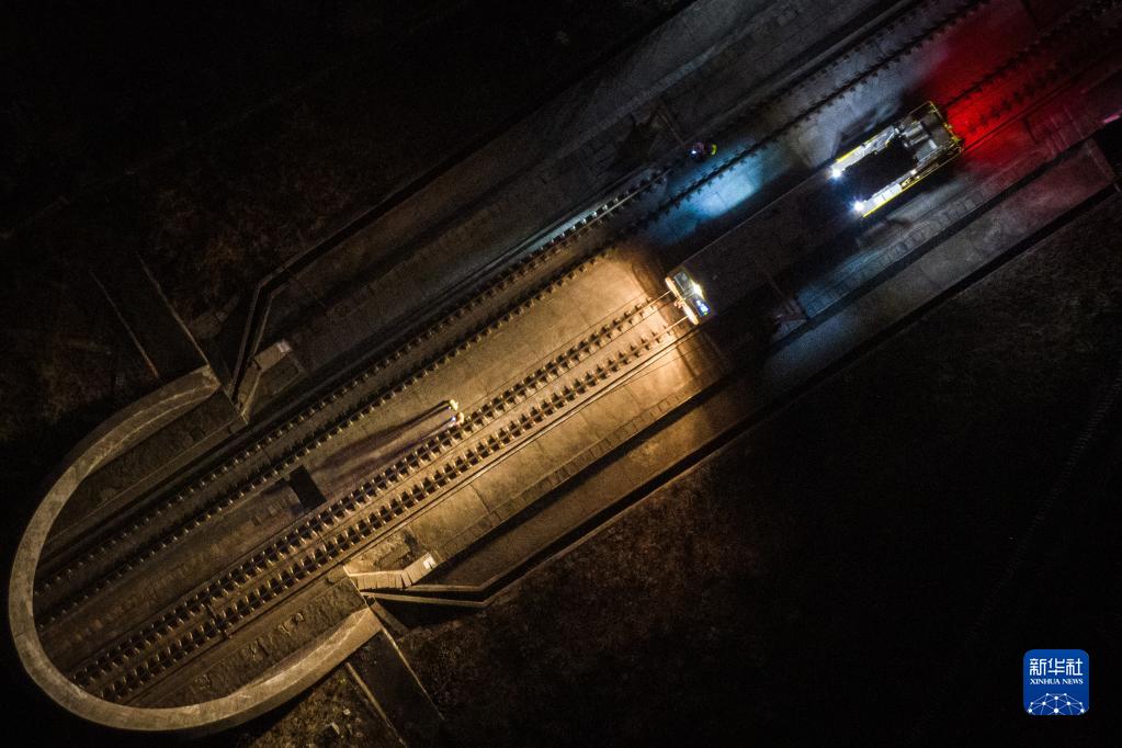 2月1日,接觸網(wǎng)檢修工人巡視隧道接觸網(wǎng)設備(無(wú)人機照片)。