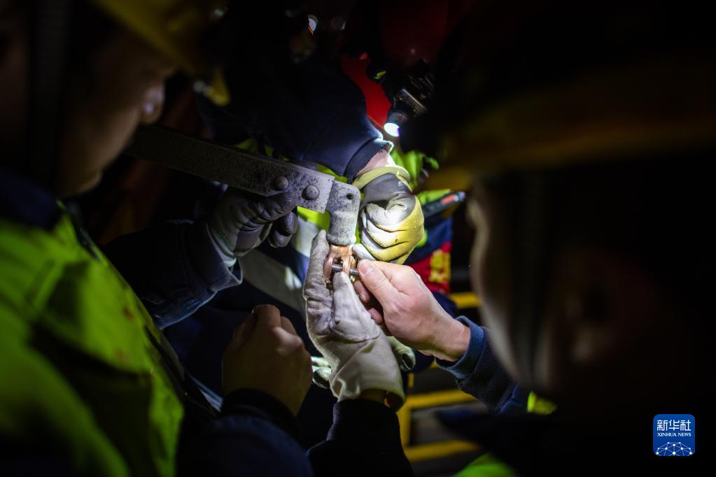 鐵路接觸網(wǎng)供電設備是否正常運轉,關(guān)系著(zhù)每趟列車(chē)的安全運行。春運期間,中國鐵路武漢局集團有限公司武漢供電段高鐵接觸網(wǎng)檢修工人利用0點(diǎn)到6點(diǎn)的“天窗點(diǎn)”,頭戴安全帽、身穿反光服,對京廣高鐵武漢段的接觸網(wǎng)進(jìn)行檢修、維護,為高鐵供電保駕護航。
