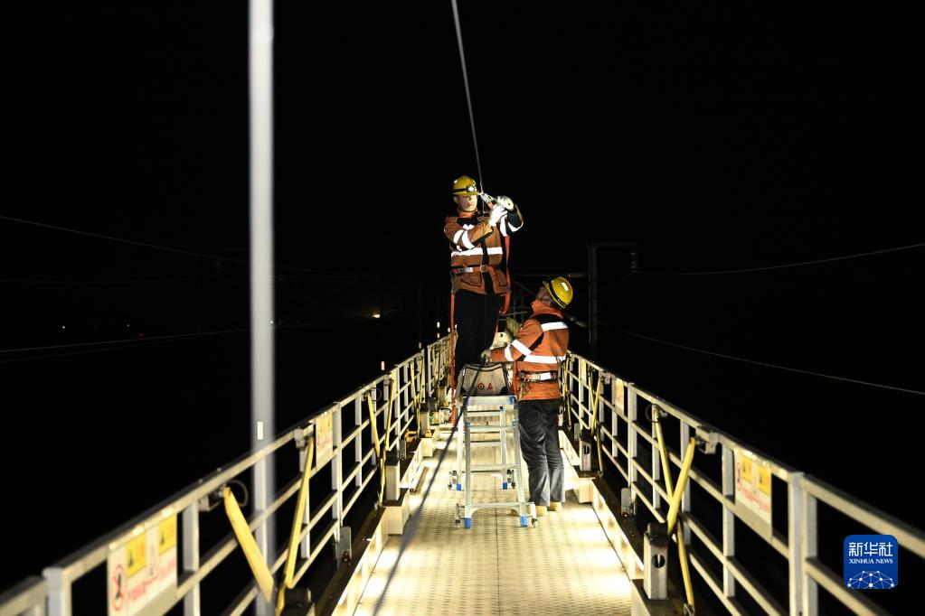 春運期間,中國鐵路上海局集團有限公司南京供電段接觸網(wǎng)維修車(chē)間的接觸網(wǎng)工們冒著(zhù)寒風(fēng),搶抓凌晨“天窗”時(shí)段,對接觸網(wǎng)設備展開(kāi)全方位檢修,排除隱患,確保列車(chē)通行安全。