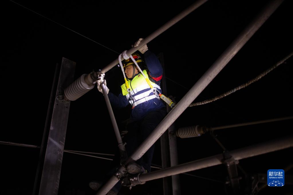 鐵路接觸網(wǎng)供電設備是否正常運轉,關(guān)系著(zhù)每趟列車(chē)的安全運行。春運期間,中國鐵路武漢局集團有限公司武漢供電段高鐵接觸網(wǎng)檢修工人利用0點(diǎn)到6點(diǎn)的“天窗點(diǎn)”,頭戴安全帽、身穿反光服,對京廣高鐵武漢段的接觸網(wǎng)進(jìn)行檢修、維護,為高鐵供電保駕護航。